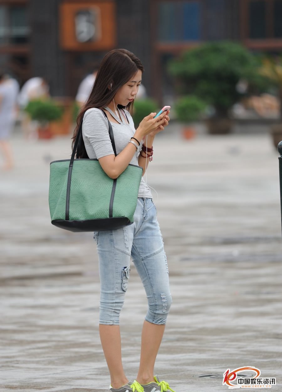 愛(ài)民廣場(chǎng)街拍的七分牛仔褲美女