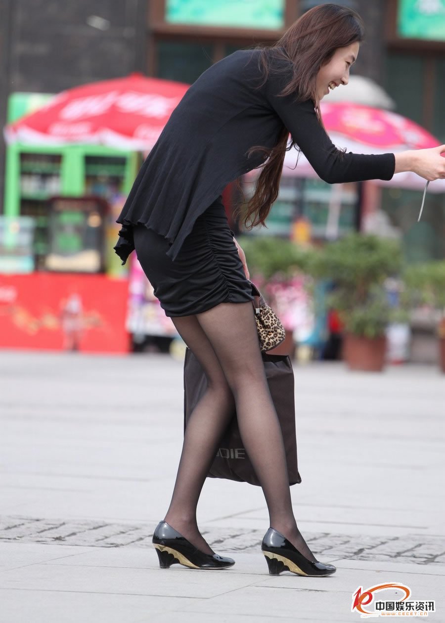 街拍的長(cháng)袖緊身連衣裙黑絲美女