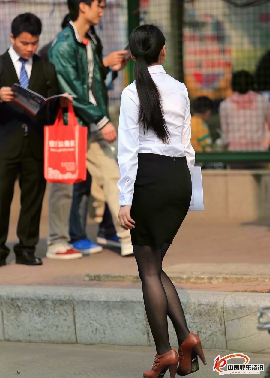 街拍的職業(yè)OL裝黑絲馬尾辮美女