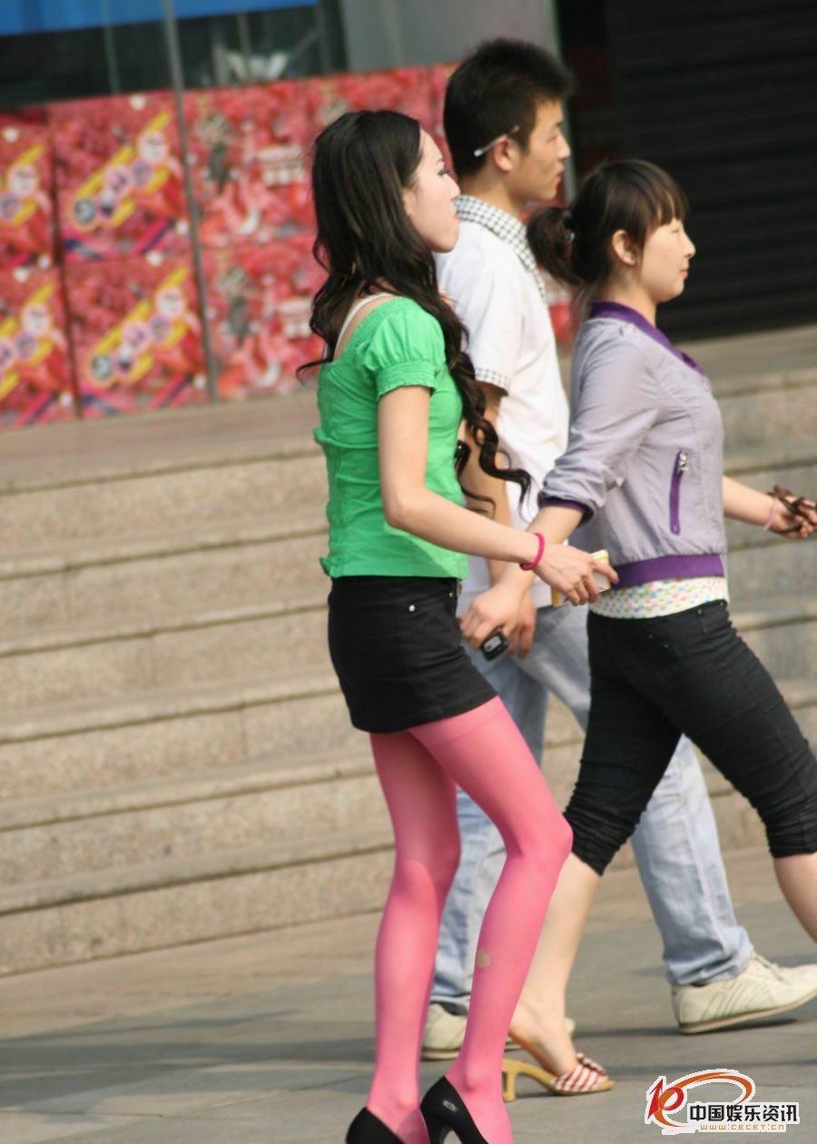 街拍粉色絲襪瘦高個(gè)清秀女子