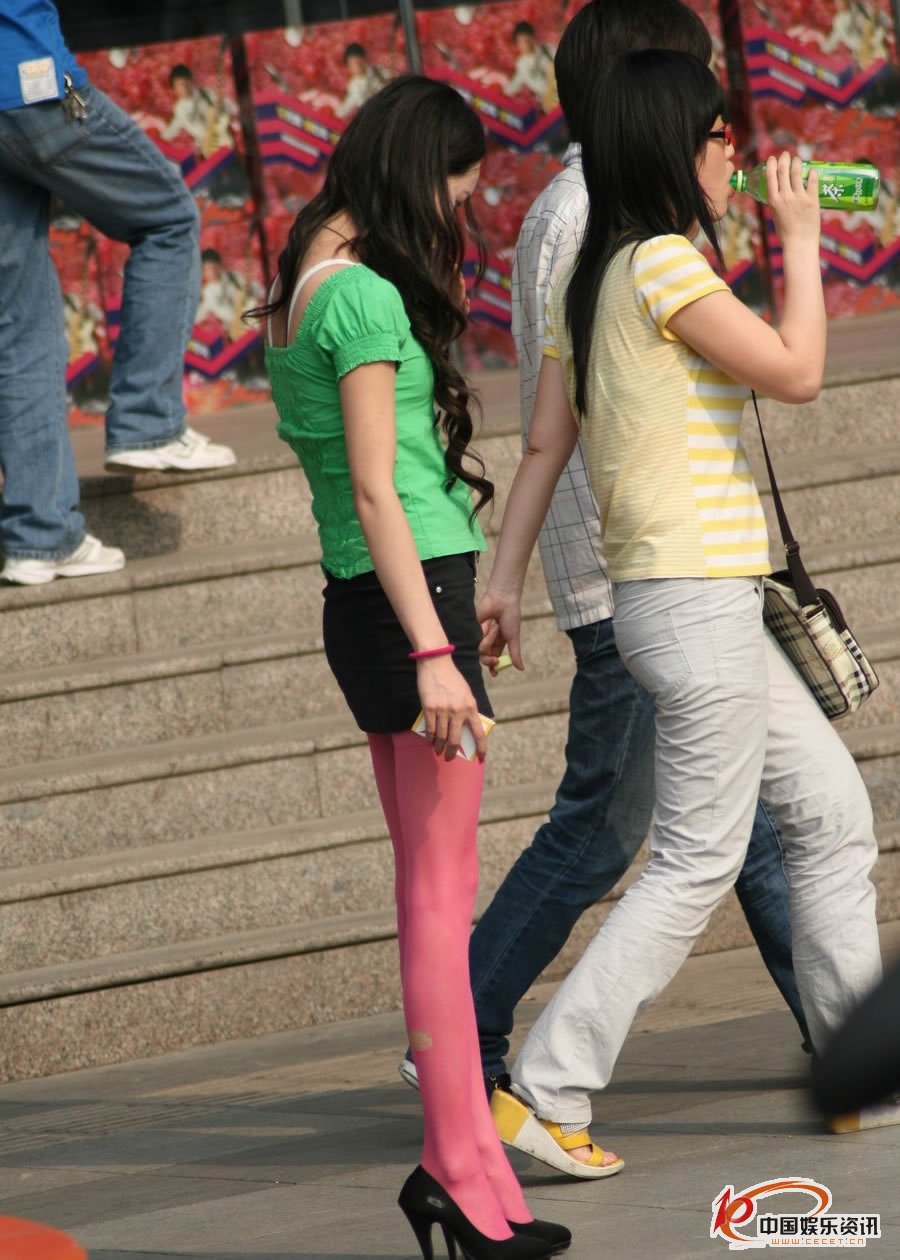 街拍粉色絲襪瘦高個(gè)清秀女子