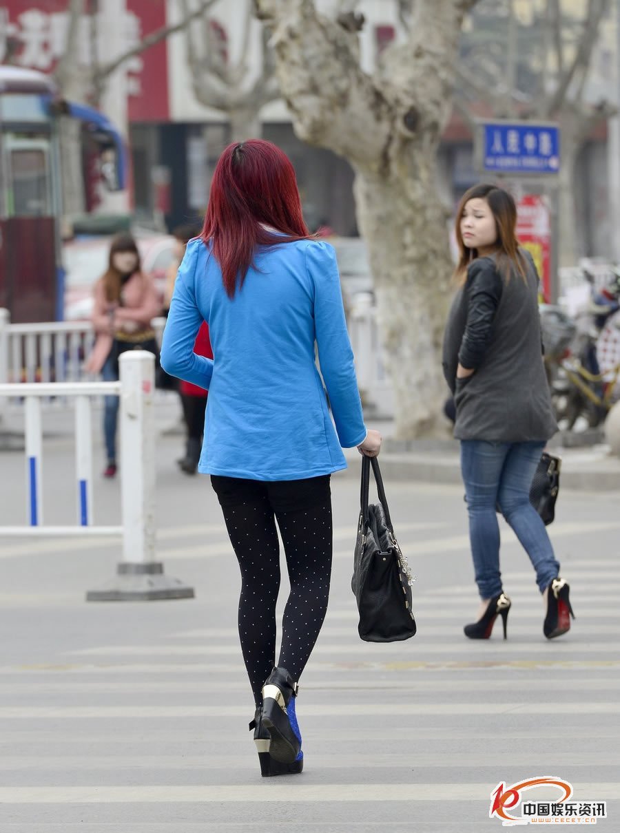 人民中路街拍的白點(diǎn)黑絲褲美女