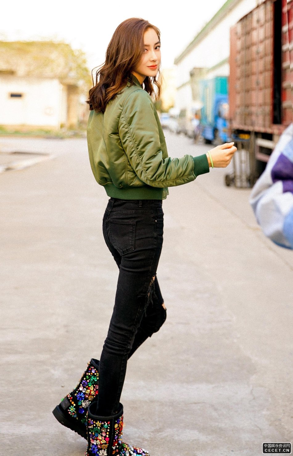 Angelababy秋冬街拍 白T外搭軍綠飛行服夾克