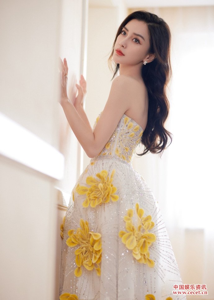 Angelababy身著(zhù)繁花抹胸紗裙露出流暢肩線(xiàn)