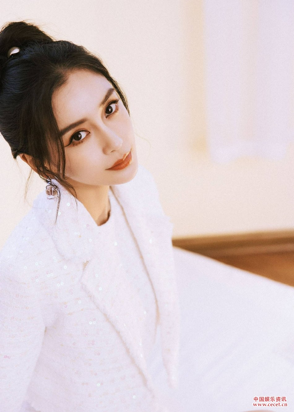 Angelababy白色小香風(fēng)套裝 直視鏡頭眼神撩人
