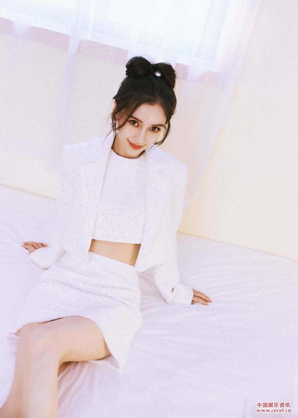 Angelababy白色小香風(fēng)套裝 直視鏡頭眼神撩人