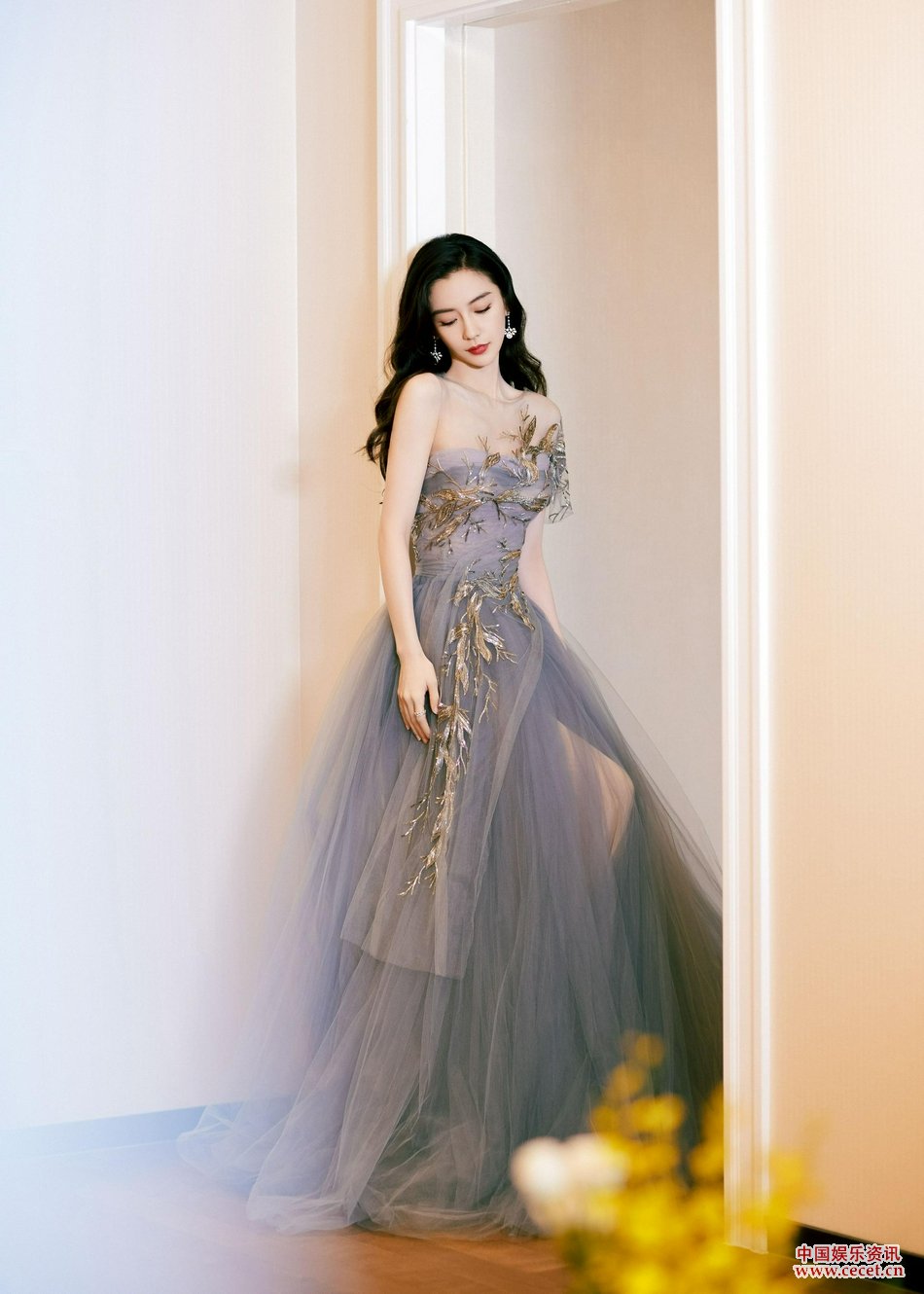 Angelababy穿霧霾紫抹胸紗裙寫(xiě)真優(yōu)雅迷人