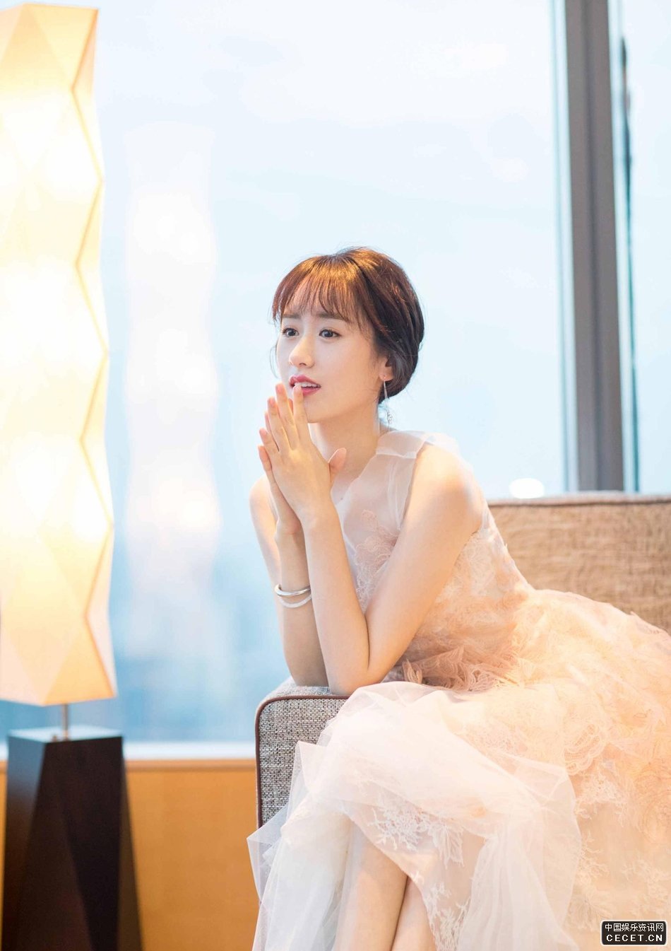 袁冰妍一襲裸色白紗長(cháng)裙 溫婉可人清甜俏皮