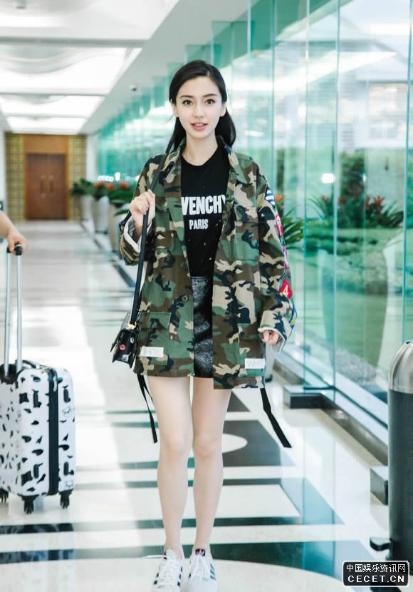 Angelababy現身機場(chǎng) 長(cháng)款軍裝外套搭配皮裙