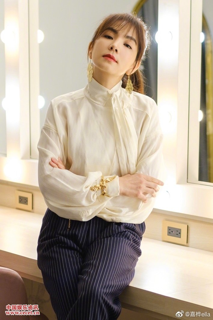 Ella穿著(zhù)白色襯衫藍色長(cháng)褲休閑愜意感覺(jué)好美
