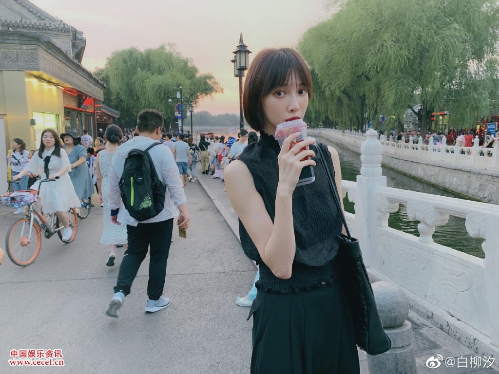 白柳汐后海荷花池拍照 齊肩短發(fā)紅唇搶眼