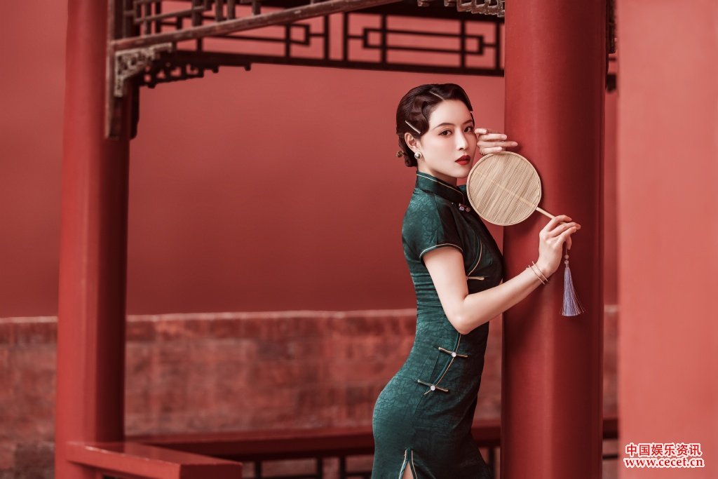 蔡蝶墨綠色旗袍古典美 宅庭內露出白皙美腿