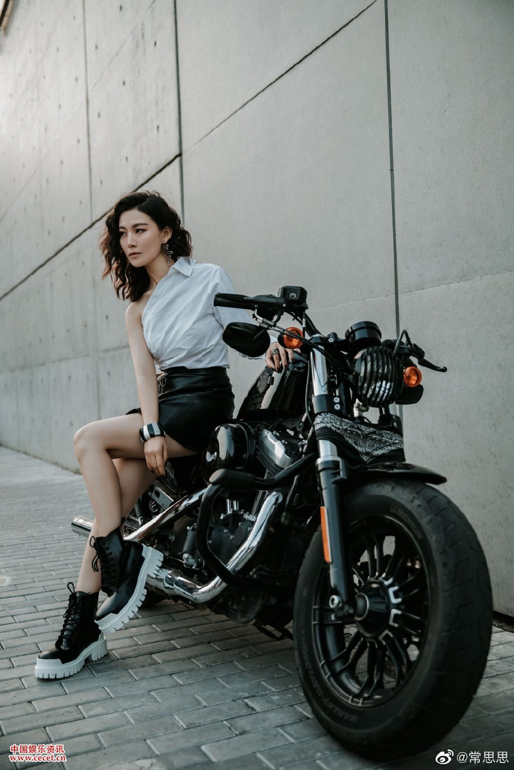 常思思機車(chē)風(fēng)炫酷造型 皮質(zhì)黑短裙大波浪風(fēng)格