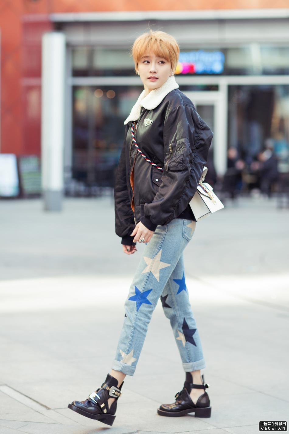陳冰短發(fā)造型亮相 淺藍仔褲搭配露踝低跟靴