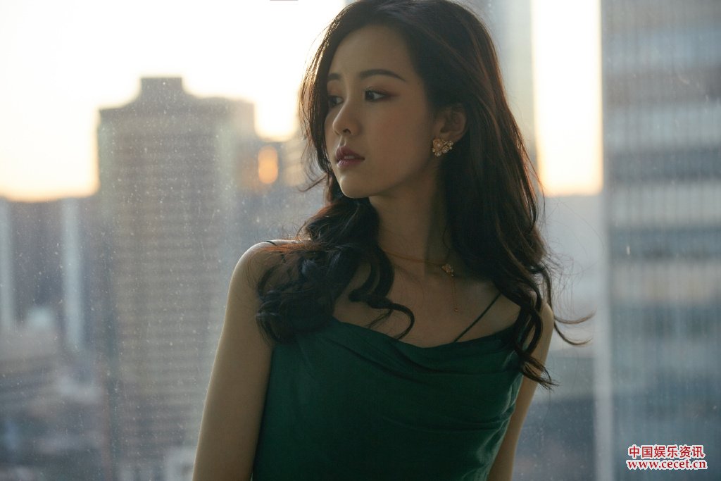 陳都靈綠色吊帶長(cháng)裙 高樓間夕陽(yáng)下綺麗明艷