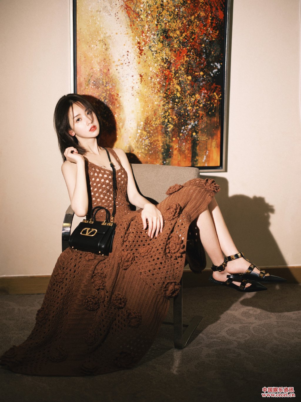 陳都靈棕色鏤空針織長(cháng)裙 精致中不失小性感