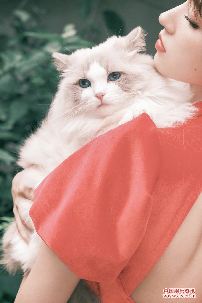 程瀟紅色露背裙抱寵物貓咪 展現絕美回眸殺