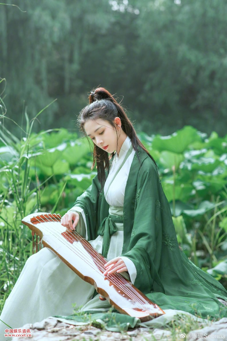 陳瑤荷塘古風(fēng)寫(xiě)真 白綠配色的漢服化身俠女