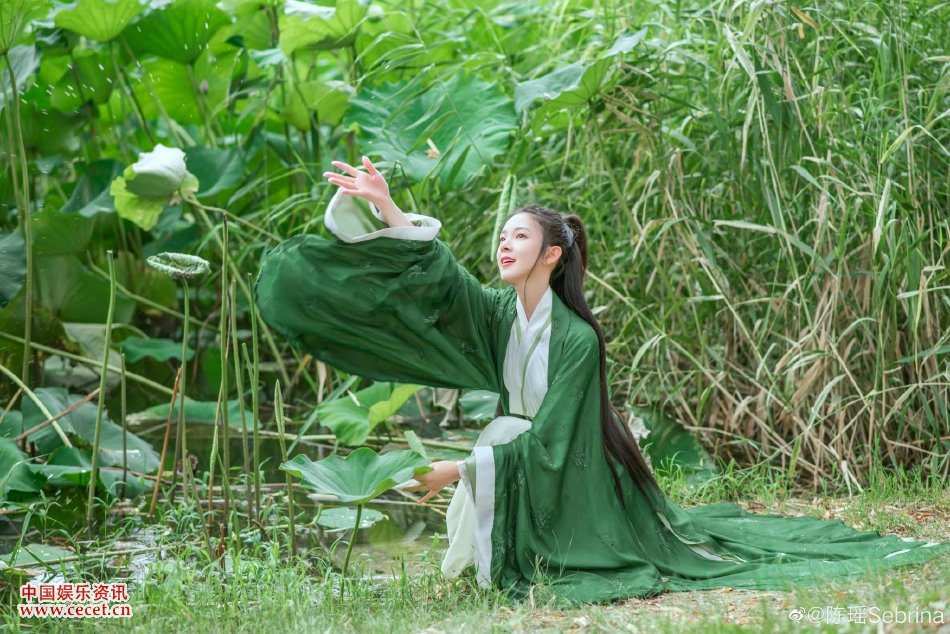 陳瑤荷塘古風(fēng)寫(xiě)真 白綠配色的漢服化身俠女