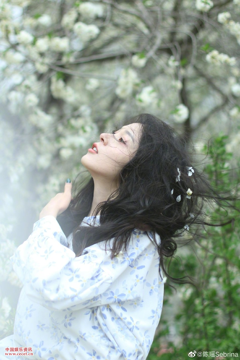 陳瑤白色碎花上衣長(cháng)發(fā)飄飄唯美氛圍感十足