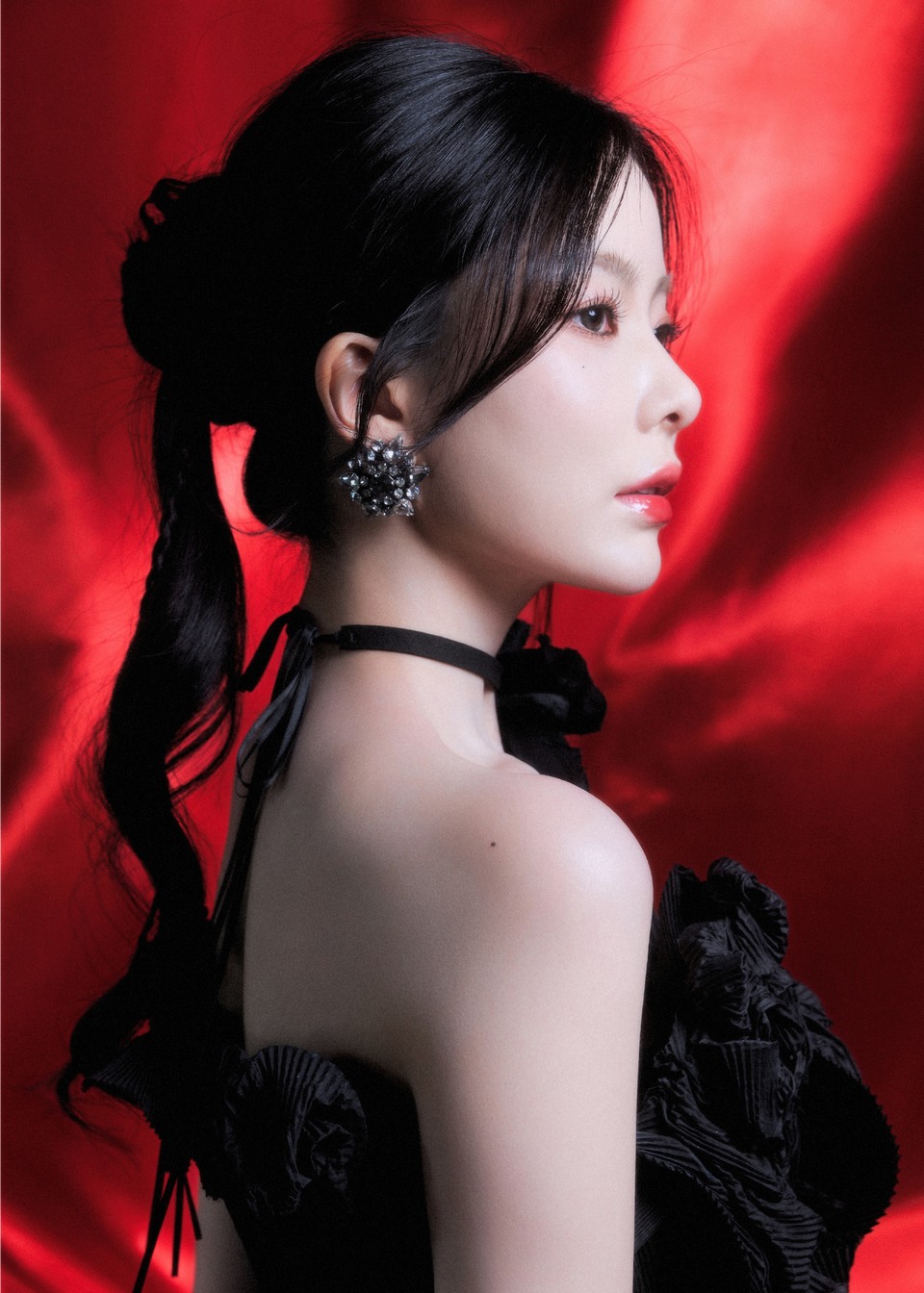 陳卓璇黑色抹胸魚(yú)尾長(cháng)裙 紅幕之下勾勒曼妙身姿