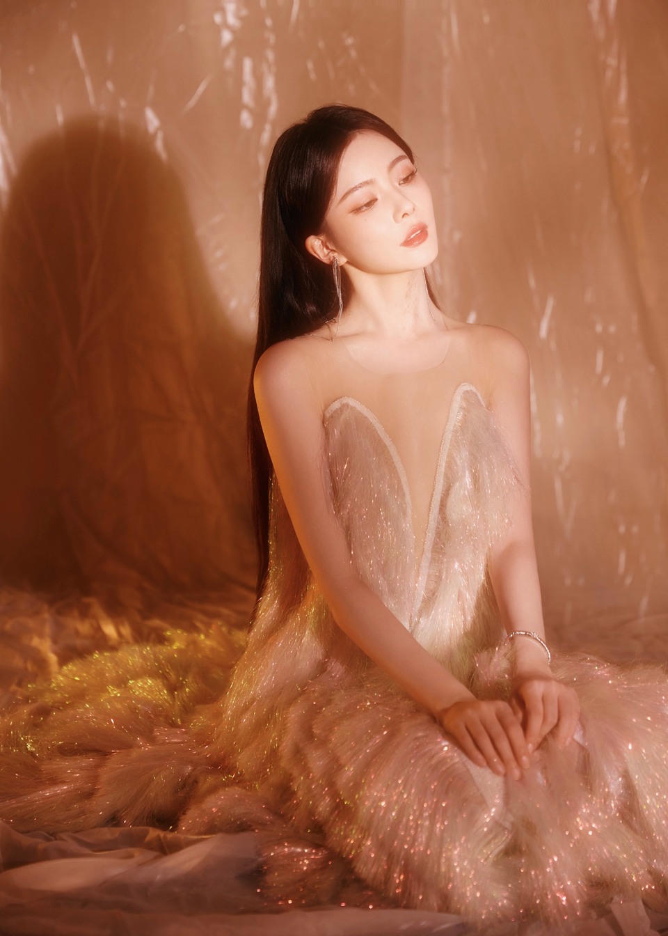 陳卓璇一襲淺調禮服 宛如星辰織就的羽翼覆于身側