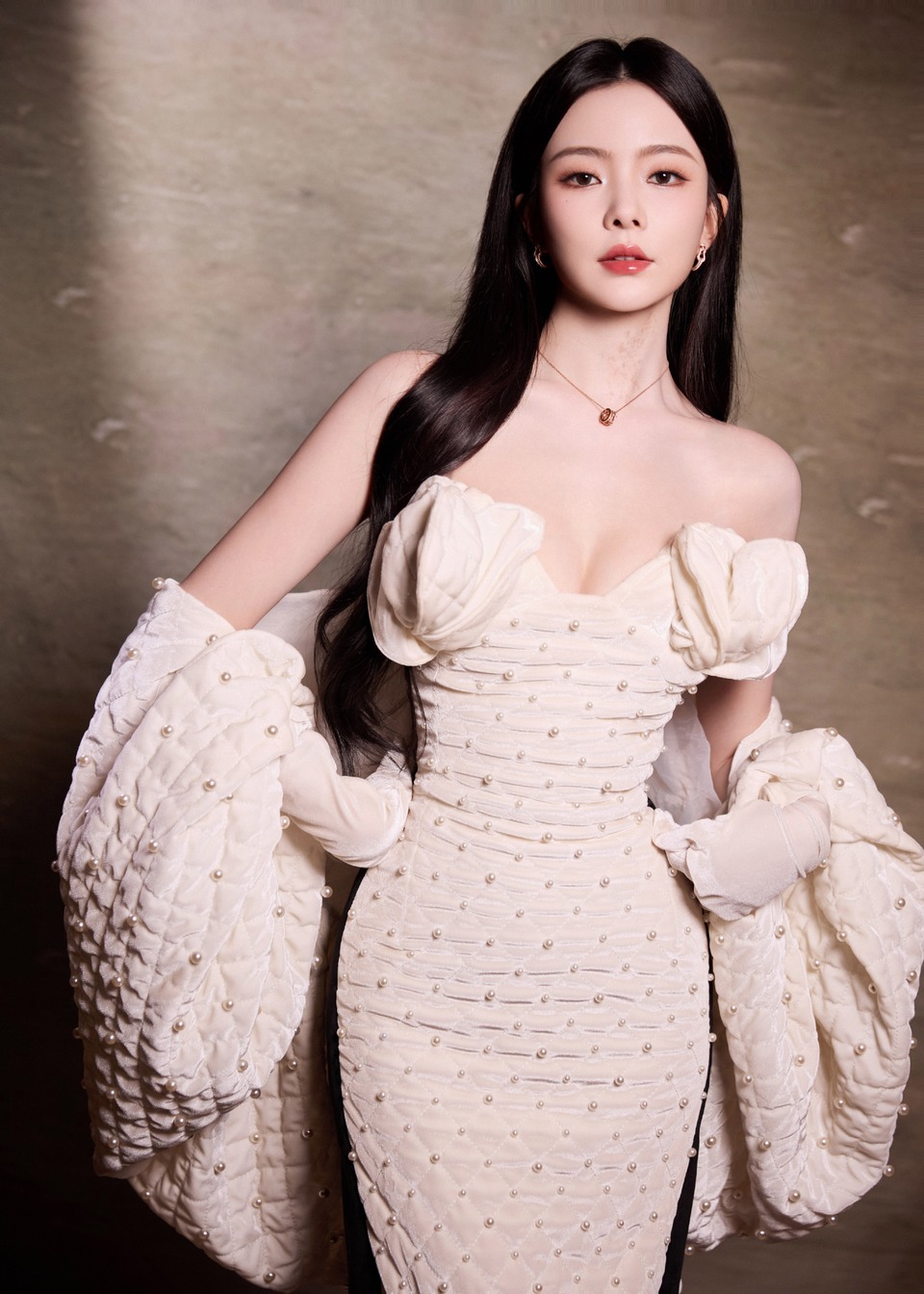 陳卓璇一襲柔美的白色抹胸裙 似月光傾灑