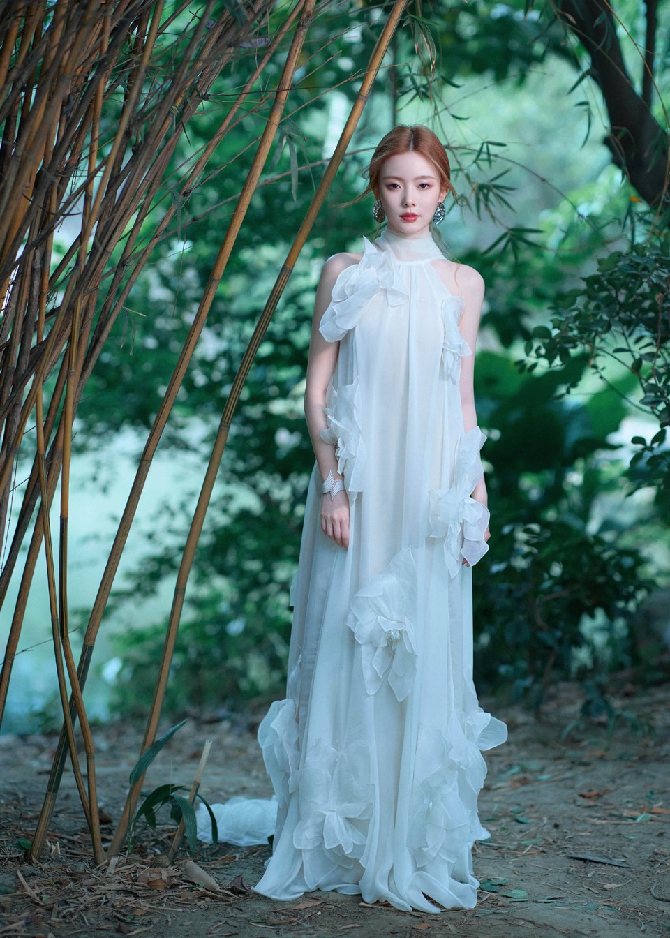陳卓璇一襲白色紗裙如夢(mèng)似幻 層疊花開(kāi)綴于裙身