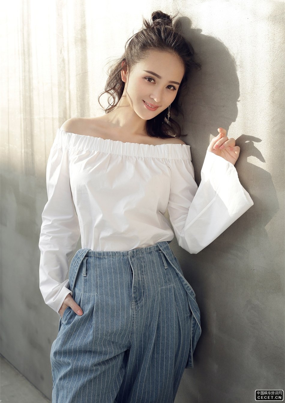 鄧莎倚墻而立寫(xiě)真大片 香肩微露盡顯陽(yáng)光活力