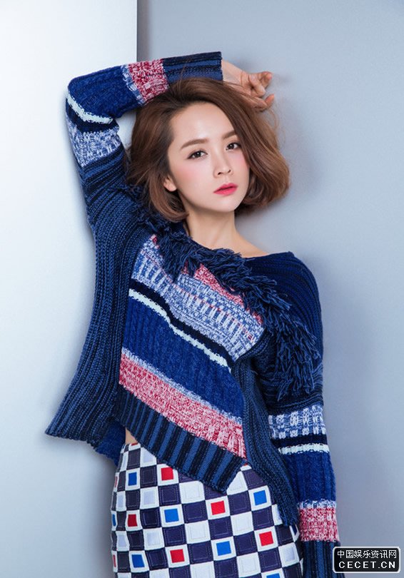 鄧莎棕色微卷短發(fā)寫(xiě)真 迷離眼神撞色毛衣短裙