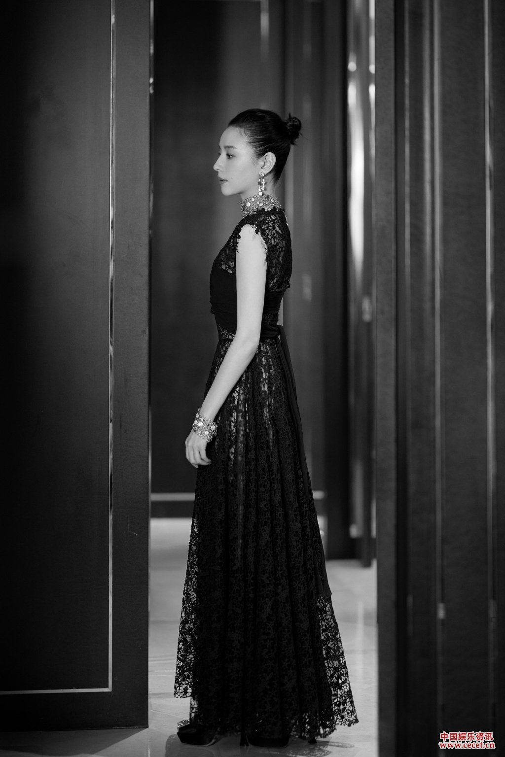 董潔身著(zhù)鏤空黑色印花長(cháng)裙流轉于光影之間