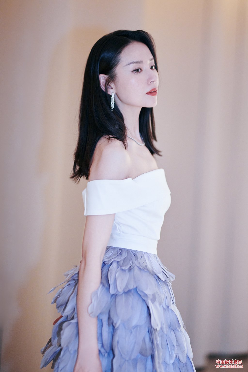 董潔藍灰一字肩羽毛裙 優(yōu)雅藍調光彩明媚綻放