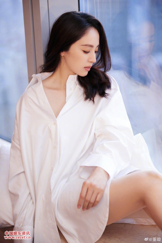 董璇寬松白襯衫下衣失蹤 領(lǐng)口半敞露香肩鎖骨