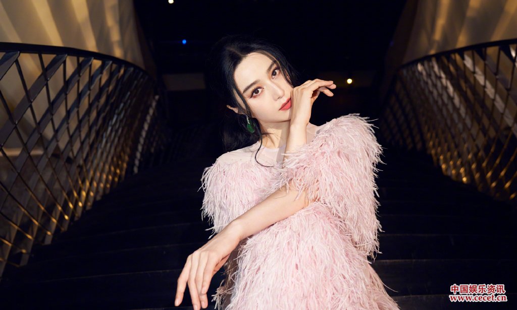 范冰冰身著(zhù)粉紫色羽毛長(cháng)裙或漫步或端坐如夢(mèng)如幻