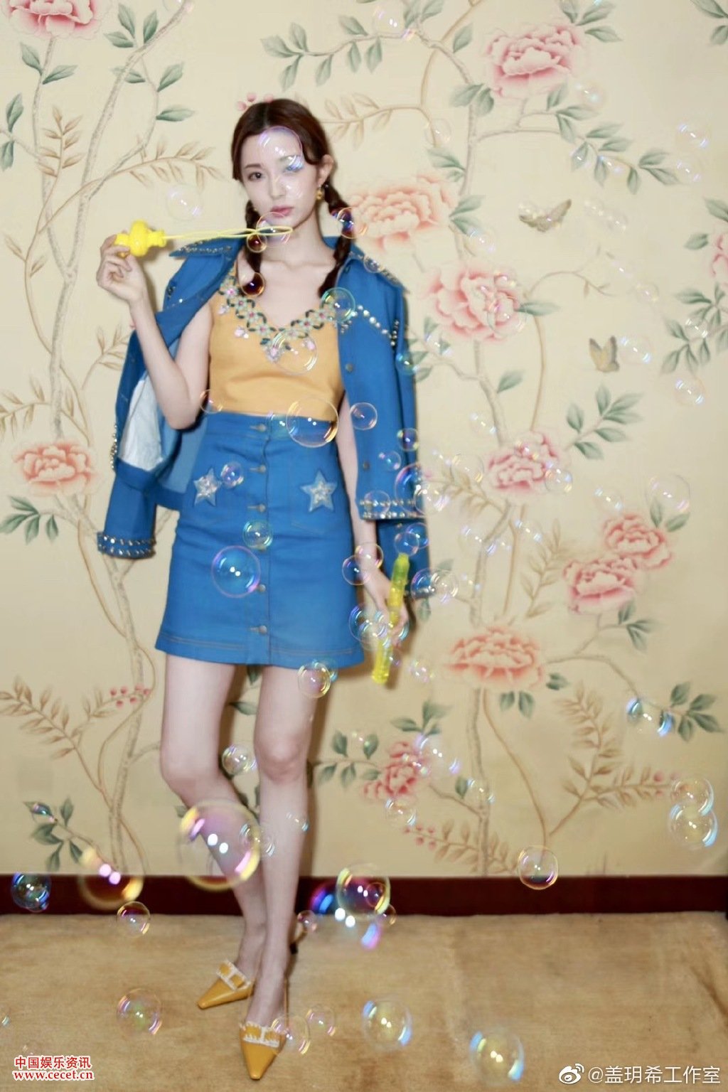 蓋玥希水藍色牛仔套裝 率性大氣中不失柔情