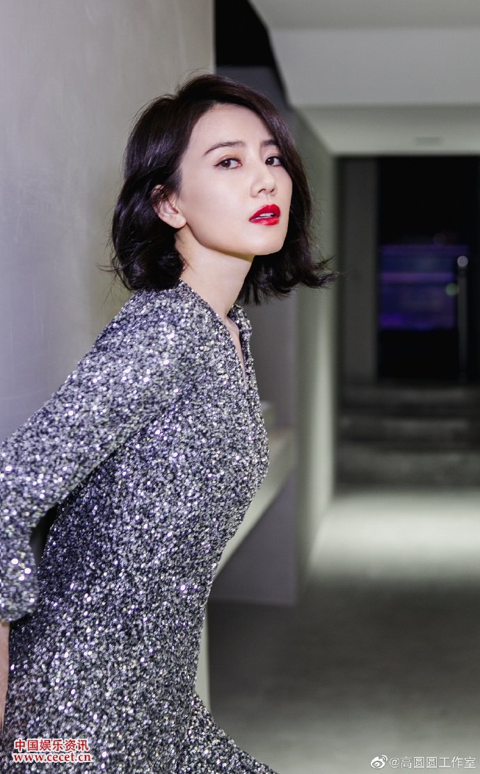 高圓圓銀色星辰碎鉆深V裙 短發(fā)微卷氣質(zhì)優(yōu)雅
