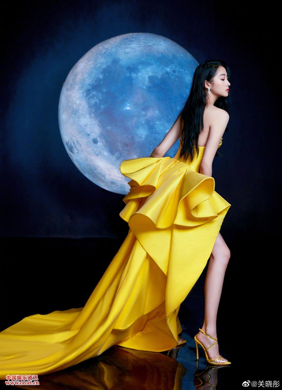 關(guān)曉彤黃色長(cháng)裙站在月亮圖案背景前大秀好身材