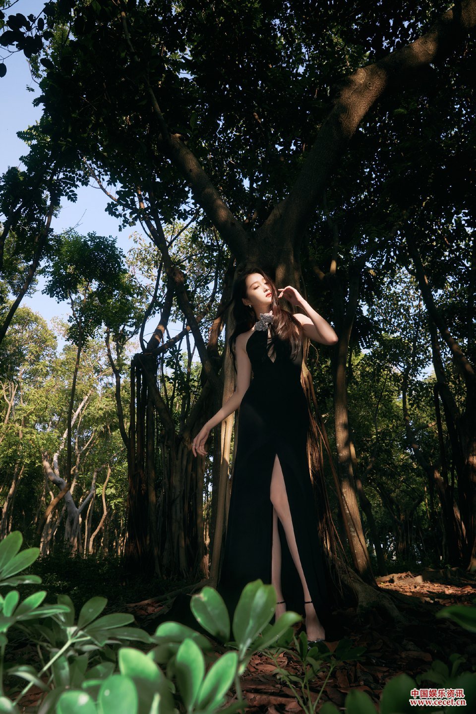 關(guān)曉彤掛脖玫瑰黑裙 于綽約樹(shù)影下葳蕤生光