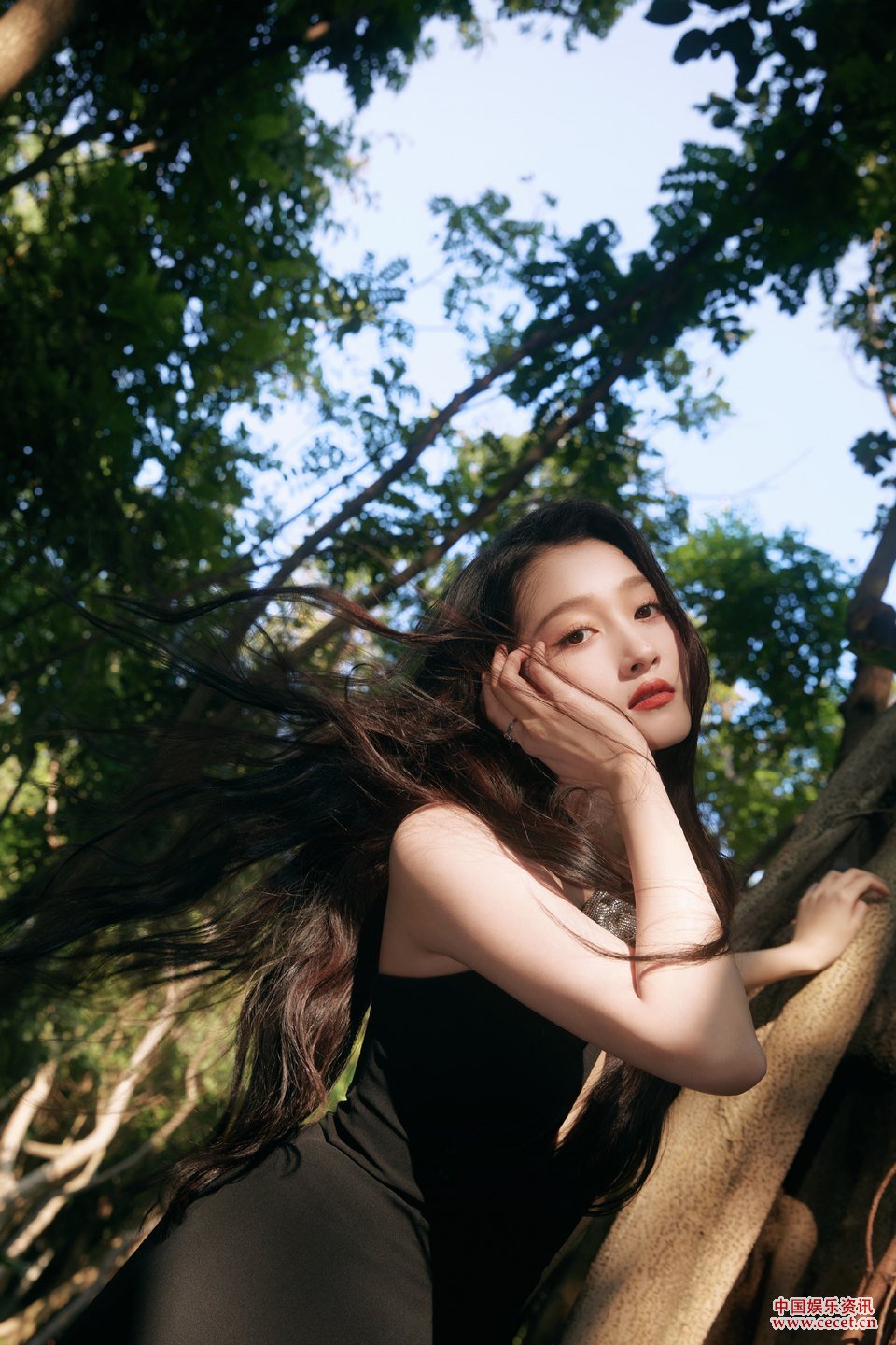 關(guān)曉彤掛脖玫瑰黑裙 于綽約樹(shù)影下葳蕤生光