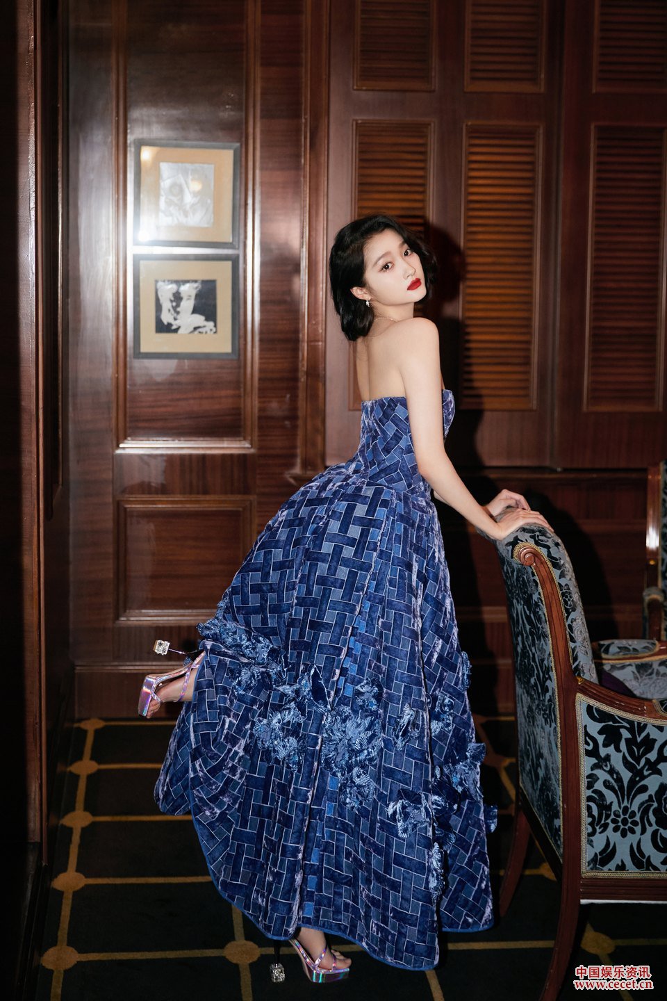 關(guān)曉彤一襲藍色花朵裙 裙上生花復古優(yōu)雅