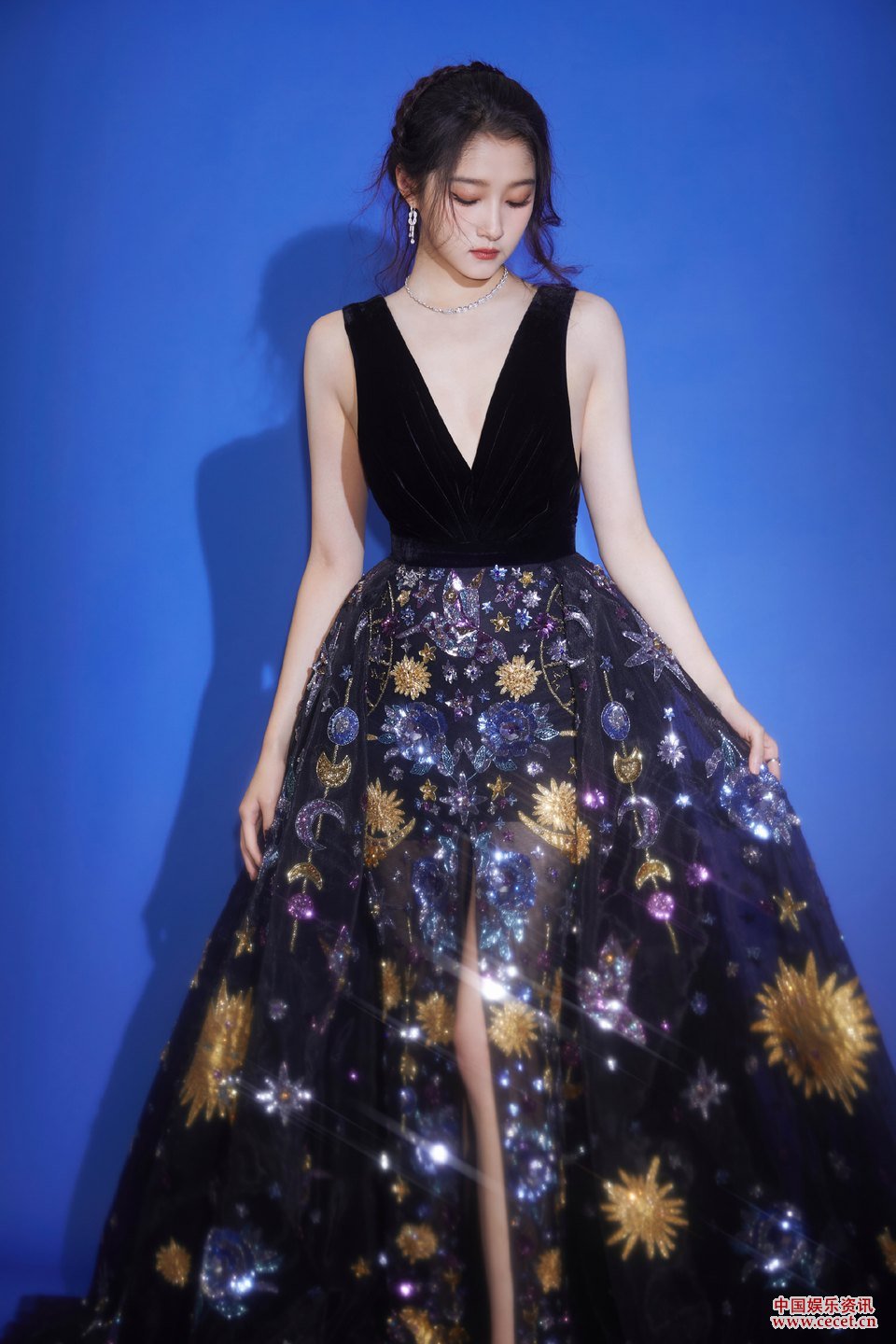 關(guān)曉彤深V開(kāi)叉刺繡裙 日月星辰雕刻綺麗優(yōu)雅