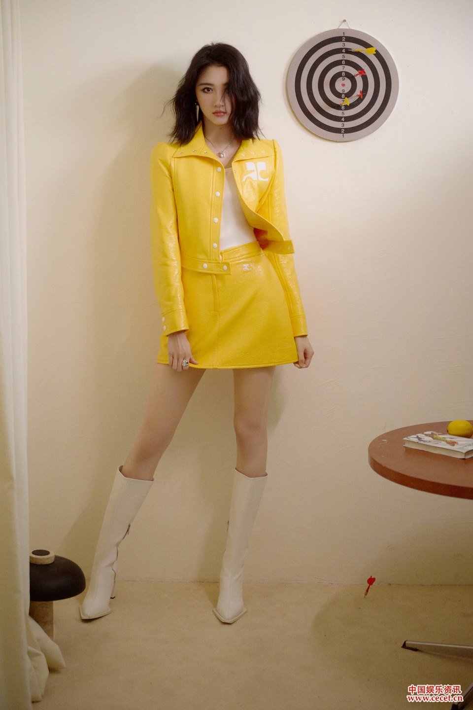 關(guān)曉彤黃色亮面機車(chē)夾克 明黃活力喚醒多巴胺
