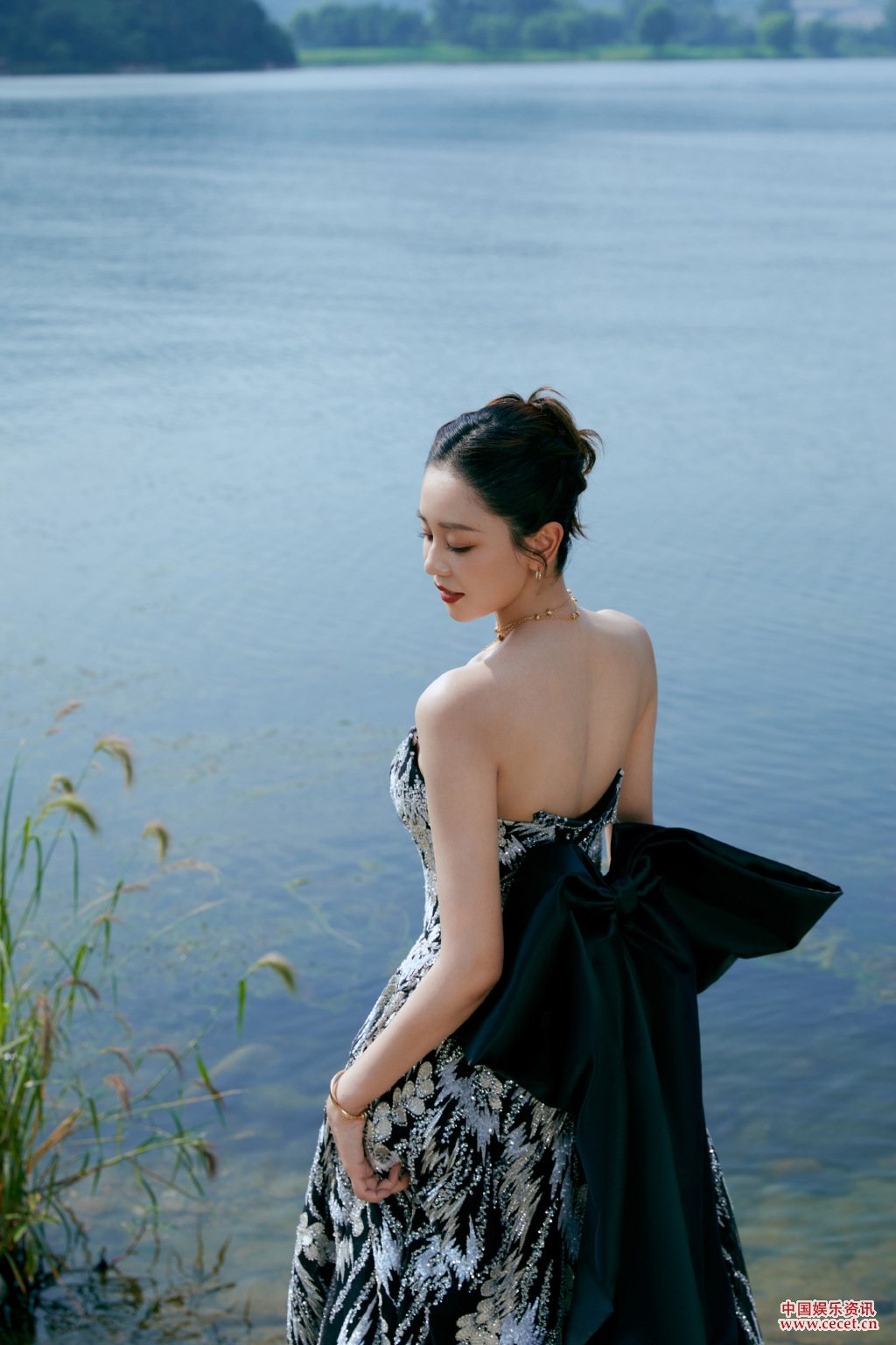 海陸黑底銀羽抹胸禮裙 山水同色怡然自得