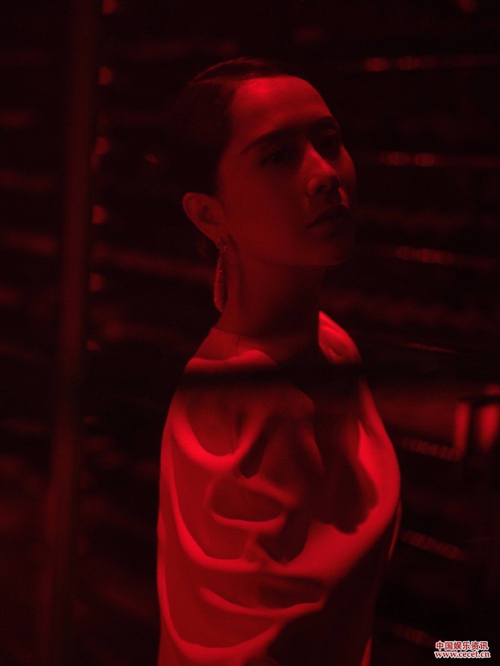 海清一身白色長(cháng)裙穿梭在酒紅色光影里自信大方