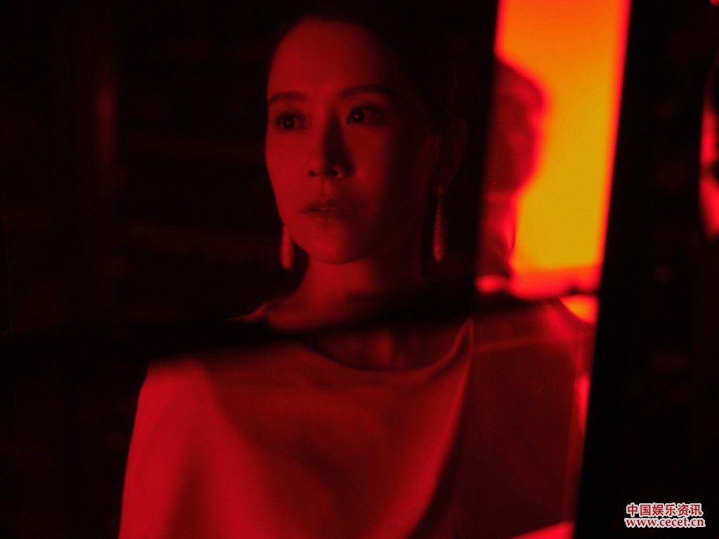 海清一身白色長(cháng)裙穿梭在酒紅色光影里自信大方