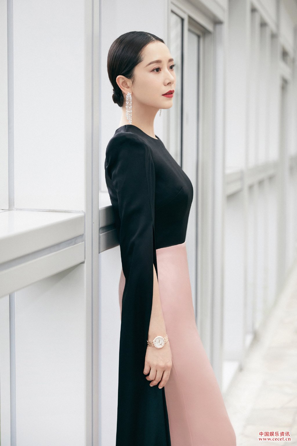 海清黑粉拼色斗篷長(cháng)裙 干練盤(pán)發(fā)摩登優(yōu)雅