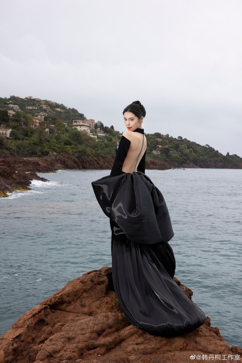 韓丹桐蝴蝶結魚(yú)尾禮服裙 海邊礁石冷感大片