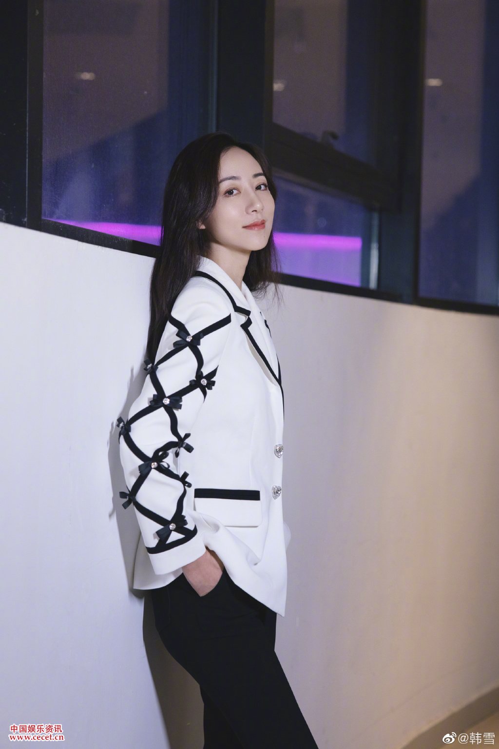 韓雪白西裝黑長(cháng)褲美照 隨性自然酷颯十足