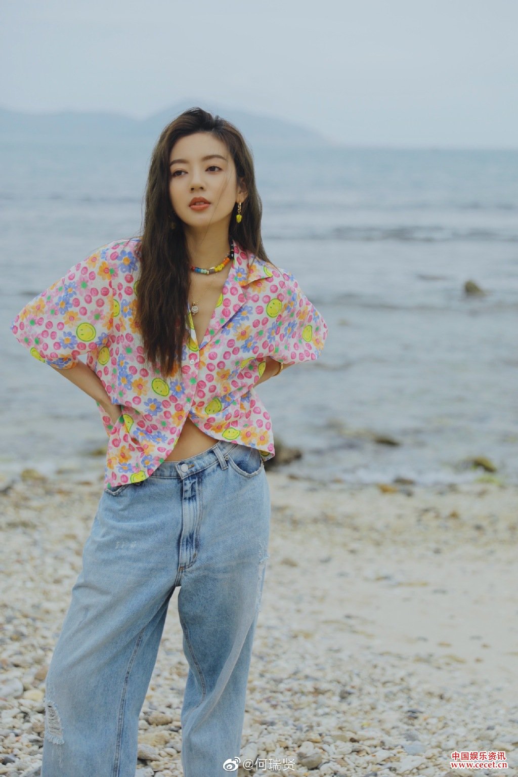何瑞賢海邊玩耍 花襯衫寬松牛仔褲休閑穿搭