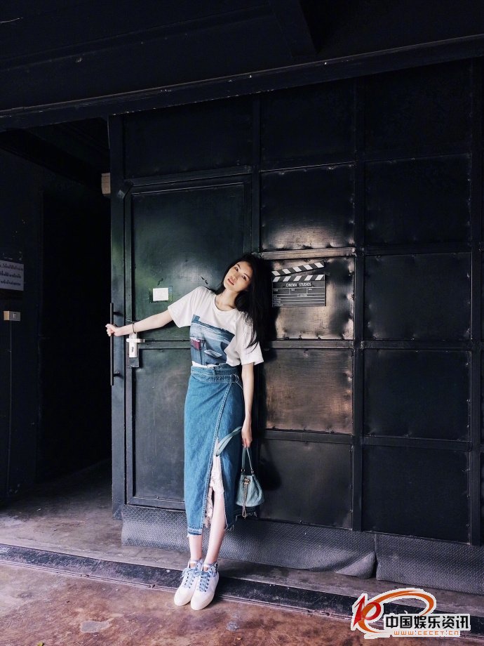 何穗穿著(zhù)休閑白T恤搭配牛仔長(cháng)裙潮范兒十足